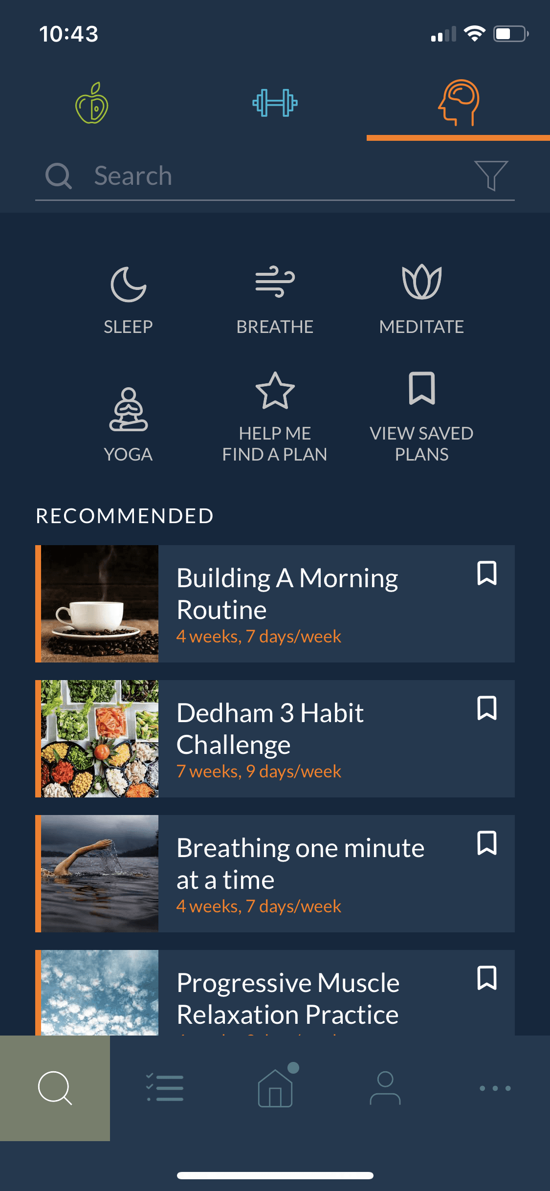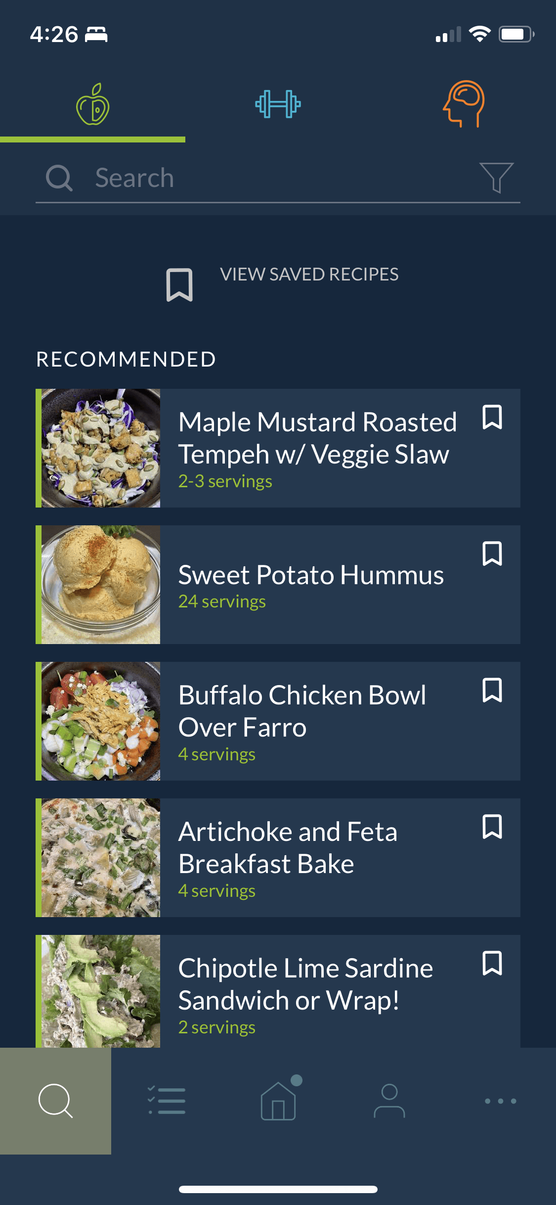 The Discover section helps athletes find programs, routines, exercises, and recipes through a keyword-driven search. They can preview each workout, read its description to see if it fits their goals, and then add it directly to their wellness plan.