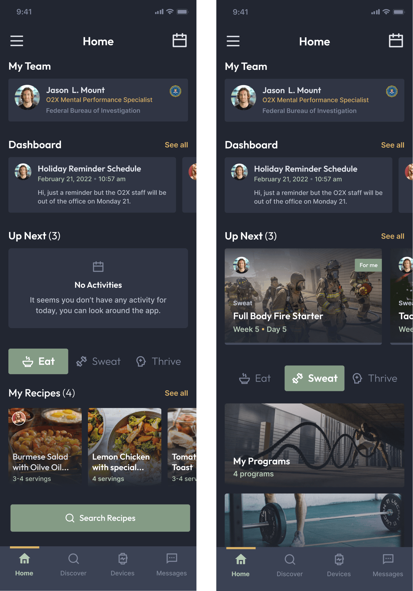 The O2X mobile app helps tactical athletes manage training, nutrition, mental health, and communication with coaches. The existing app was visually outdated, hard to navigate, and confusing to use, which reduced engagement and consistency. The core problem was to simplify and modernize the experience so athletes could easily understand programs, track progress, and stay connected, supporting better performance and wellness without added friction.
