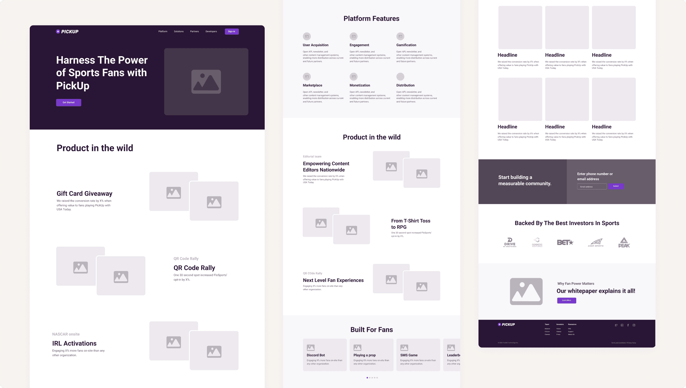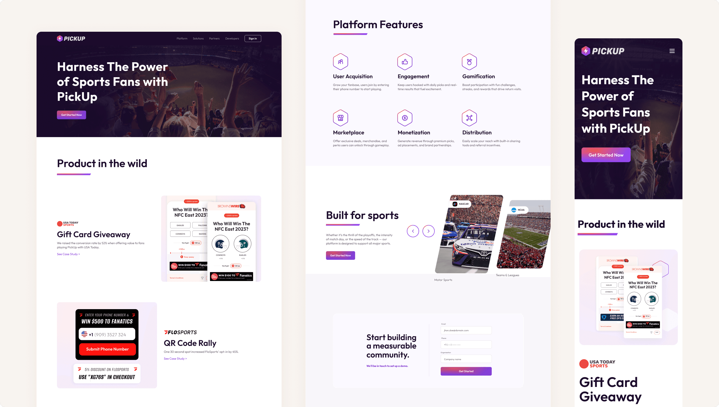 For the homepage, the main objective was to clearly communicate the value proposition of the Pickup sport widget, highlighting its key features and benefits, as well as showcasing case studies to reinforce credibility and trust with both users and investors. The design needed to convey strength and performance while staying aligned with the brand identity, ensuring visual consistency and coherence across the experience.