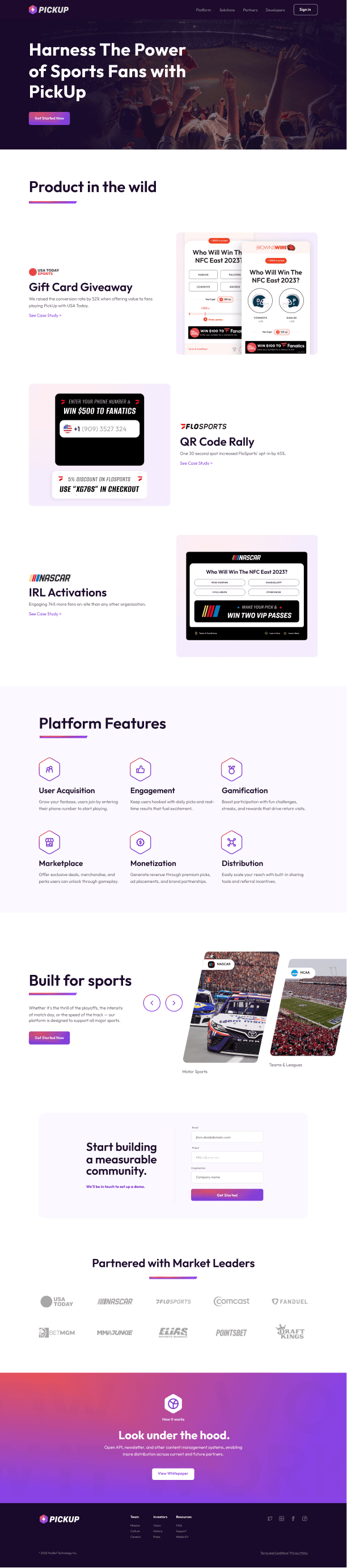 Pickup needed a clear and modern website to introduce its sports prediction widget to potential investors and users for the first time. Since this was the initial public explanation of the product, the challenge was to communicate what the widget does, how it works, and why it is valuable in a clear and concise manner. The goal was to present a technical tool in an intuitive and engaging format, allowing visitors to quickly understand the experience of making fast and fun sports picks within publisher content.