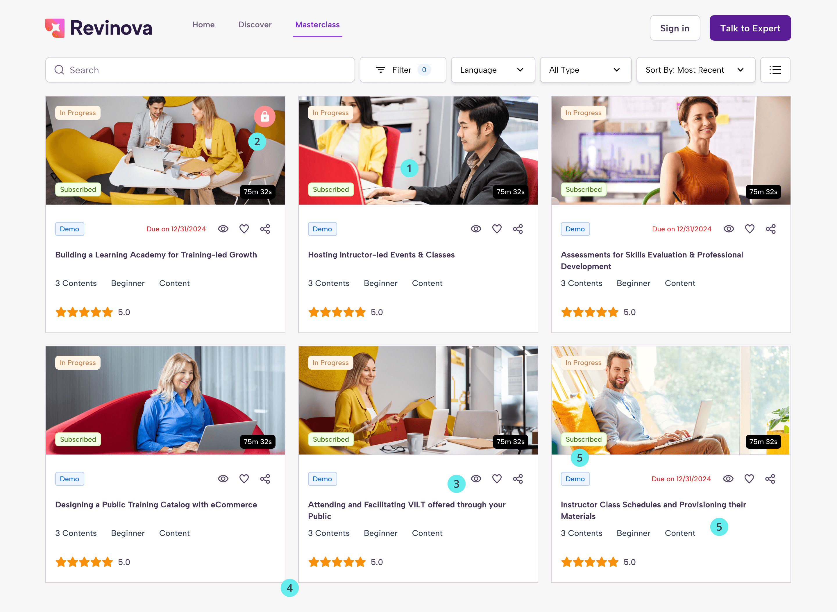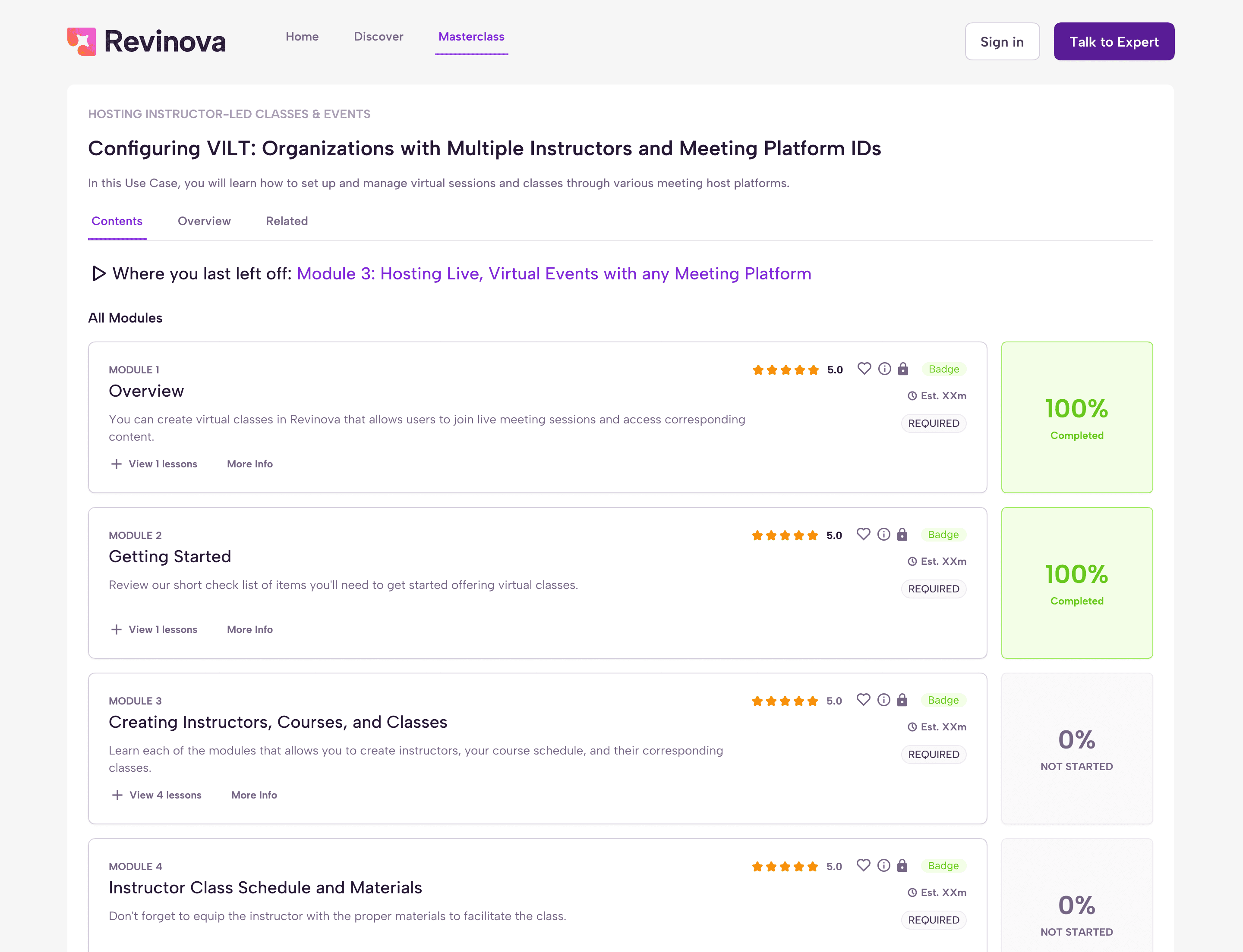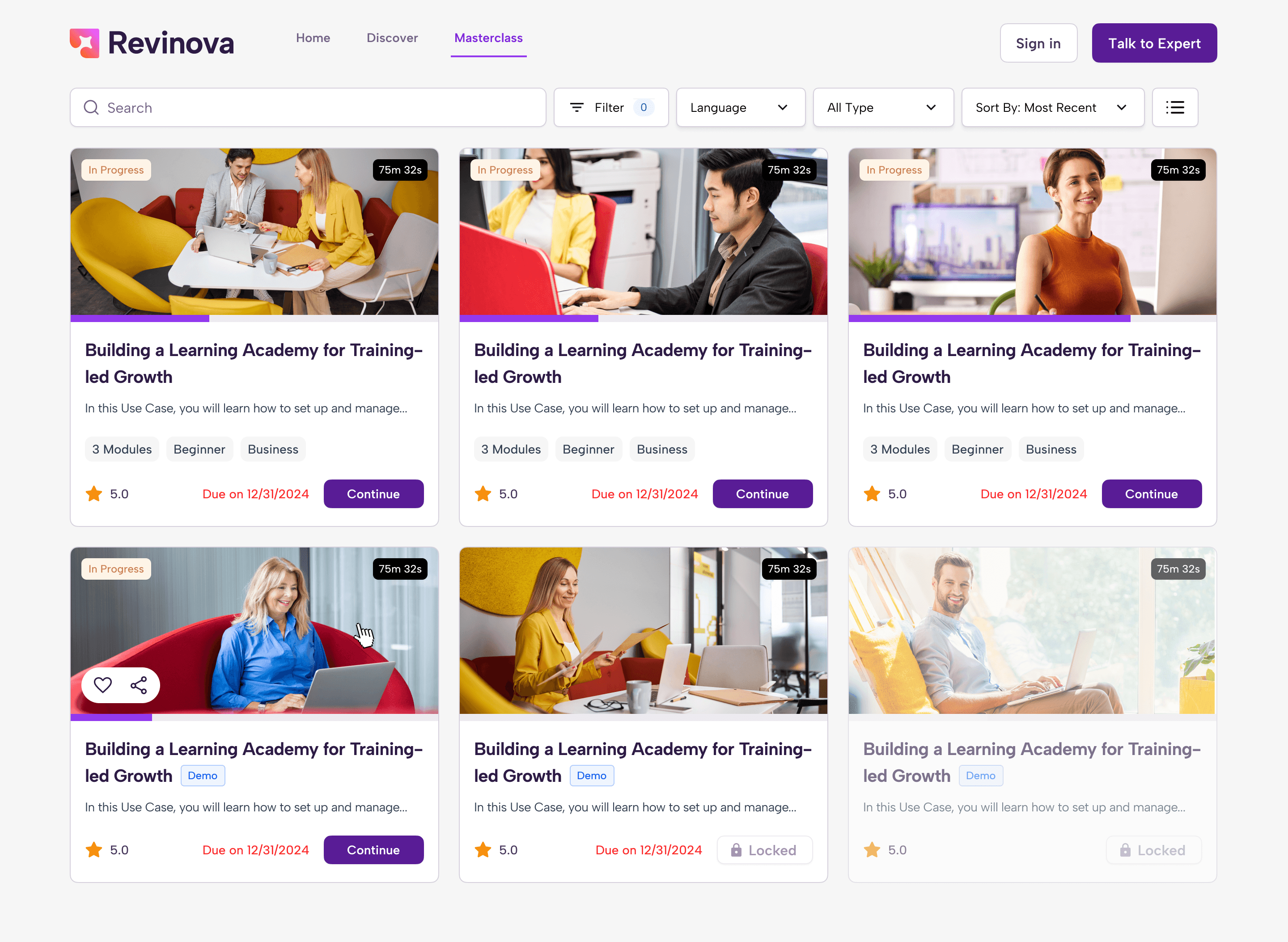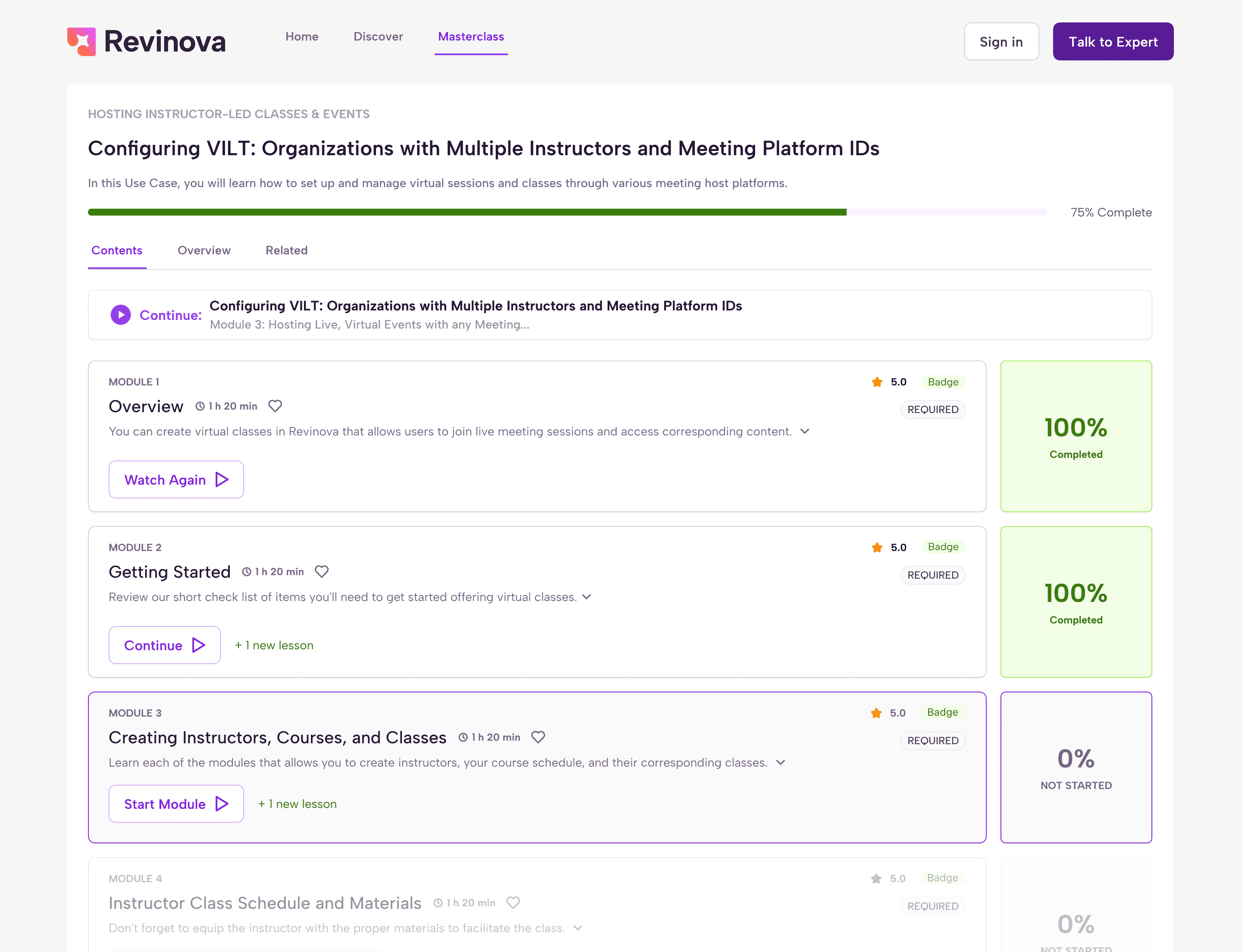 For the masterclass page, where users see the course chapters and module descriptions, we added a much-needed progress bar. We also worked on the visual hierarchy and defined the different module states, such as completed, not started, and locked, including how each state would look and behave.
